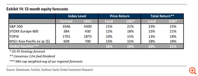 Η επιτάχυνση της παγκόσμιας οικονομίας και της κερδοφορίας των εταιρειών το 2021 και το 2022 στηρίζει το σενάριο για ένα αρκετά ισχυρό έτος για τις αγορές μετοχών συνολικά, συμβάλλοντας σε ένα ακόμη έτος για τη νέα bull market ή οποία διακόπηκε από την πανδημία. Οι στόχοι που δίνει η G.S για τις αγορές σε κάθε περιοχή υποδηλώνουν άνοδο 20% συνολικά στην απόδοση των παγκόσμιων μετοχών το επόμενο έτος. Για τον αμερικάνικο δείκτη S&P βλέπει άνοδο 23%, για τον πανευρωπαϊκό δείκτη Stoxx Europe 600 άνοδο 15%, για τον Topix 13% και για τον MSCI Ασίας -Ειρηνικού εκτός Ιαπωνίας 18%.