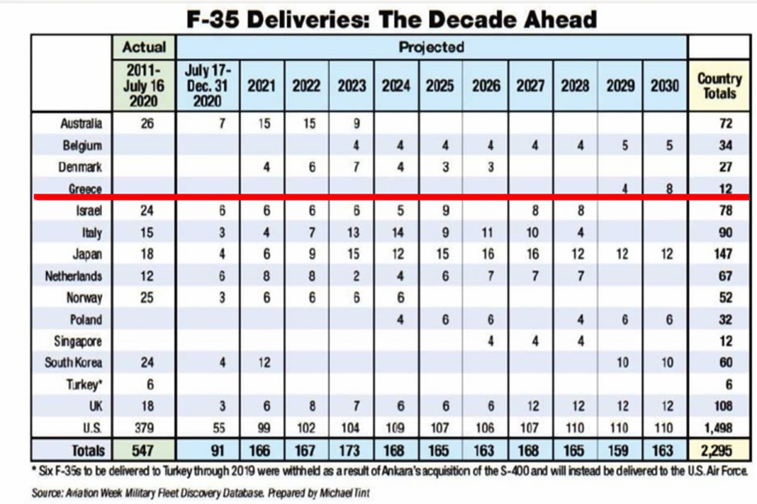 Υπογραμμίζουμε πως για αγορά μόλις δώδεκα (12) F35 οι ΗΠΑ ενέγραψαν και την Ελλάδα στον κατάλογο πελατών τους, για το 2029-2030(!), προκειμένου να πάρει τόσα F35 όσα και η Σιγκαπούρη! Παραθέτουμε τον πίνακα.
